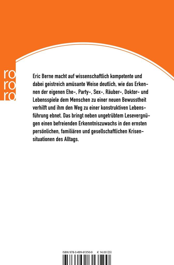 Eric Berne macht auf wissenschaftlich kompetente und dabei geistreich amüsante Weise deutlich, wie das Erkennen der eigenen Ehe-, Party-, Sex-, Räuber-, Doktor- und Lebensspiele dem Menschen zu einer neuen Bewusstheit verhilft und ihm den Weg zu einer konstruktiven Lebensführung ebnet. Das bringt neben ungetrübtem Lesevergnügen einen befreienden Erkenntniszuwachs in den ernsten persönlichen, familiären und gesellschaftlichen Krisensituationen des Alltags.