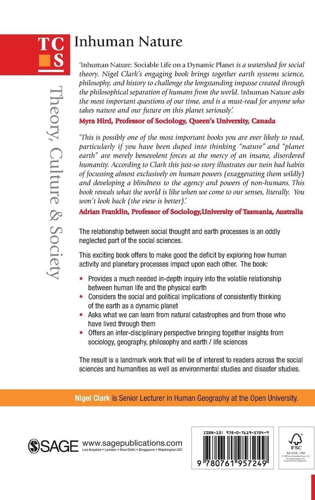 Inhuman Nature: Sociable Life on a Dynamic Planet is a watershed for social theory. Nigel Clark's engaging book brings together earth systems science, philosophy, and history to challenge the longstanding impasse created through the philosophical separation of humans from the world. This book does not simply 'take nature into account': fires, floods, volcanoes, climate change, and hurricanes take centre-stage in this thorough re-writing of the organic and inorganic. Inhuman Nature asks the most important questions of our time, and is a must-read for anyone who takes nature and our future on this planet seriously