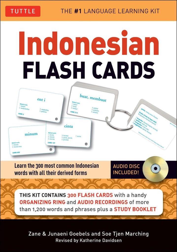These Indonesian flashcards are an excellent way of gradually increasing your Indonesian vocabulary. Their compact format makes them easy to carry around with you as you go about your regular routine, and you can make use of any spare minutes throughout the day to test yourself or take the next step in your Indonesian language learning. The key to building a working vocabulary is frequent exposure rather than prolonged study sessions, and with these flash cards it is easy to make good use of any odd minutes that would otherwise be wasted—on the bus, standing in line, or over a cup of coffee.All disc content is alternatively accessible on tuttlepublishing.com/downloadable-content.