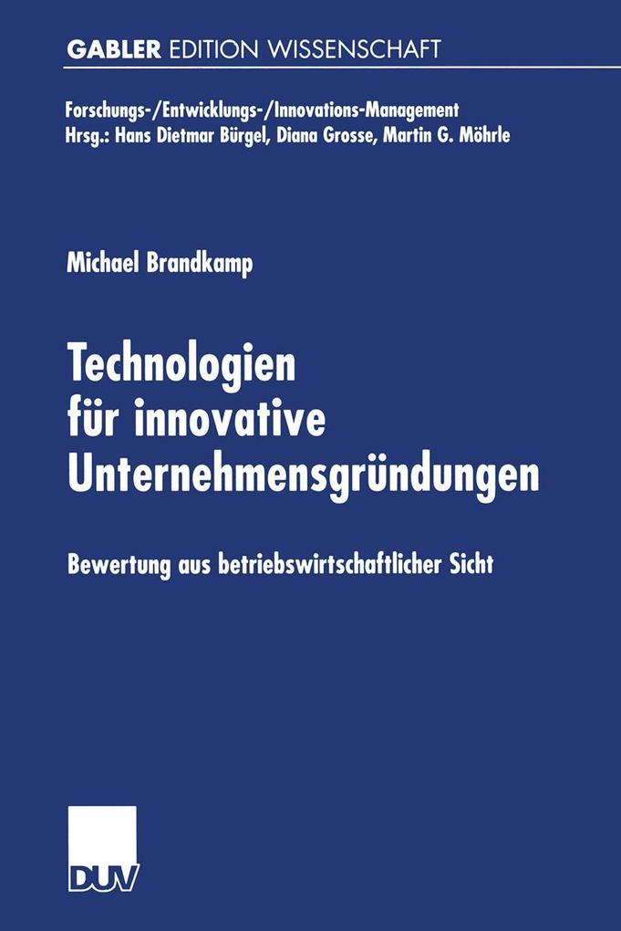 1 Einleitung. - 1. 1 Problemstellung und Untersuchungsziel. - 1. 2 Aufbau der Untersuchung. - 1. 3 Auswahl der Technologieklassifikation. - 2 Verfahren der Technologiebewertung. - 2. 1 Technikfolgenabschätzung: Verfahren, die vorwiegend die gesellschaftlichen Folgen und Risiken von Technologien bewerten. - 2. 2 Verfahren der Technologiebewertung, die vorwiegend den Innovationsanspruch betrachten. - 2. 3 Strategisches Technologiemanagement: Verfahren, die die Eignung von Technologien für Unternehmen bewerten. - 2. 4 Verfahren zur Bewertung von Technologiegebieten für innovative Gründungen. - 3 Entwicklung eines Bezugsrahmens. - 3. 1 Zweck des Bezugsrahmens. - 3. 2 Grundlegende Begriffe. - 3. 3 Hauptelement des Bezugsrahmens: Der Unternehmensbegriff von Gutenberg. - 3. 4 Innovation als Teil des betrieblichen Leistungsprozesses. - 3. 5 Innovation als Investition. - 3. 6 Innovation als Investitionsentscheidung des Gründers. - 3. 7 Zusammenhang zwischen Technologiebewertung, Innovation und innovativer Unternehmensgründung. - 3. 8 Beurteilung des Innovationsprojekts als Investition: Auswahl der Bewertungsmethode. - 4 Bewertungsmodell für Technologien innovativer Gründungen. - 4. 1 Einfluß von Merkmalen der Technologiegebiete auf Innovationsvorhaben. - 4. 2 Potential von technologieorientierten Unternehmensgründungen. - 4. 3 Beurteilung von Technologiegebieten im Bewertungsmodell. - 5 Bewertung von Technologiegebieten. - 5. 1 Datengrundlage. - 5. 2 Neue Werkstoffe (NWS). - 5. 3 Nanotechnologie (NAT). - 5. 4 Mikroelektronik (MEL). - 5. 5 Photonik(PHO). - 5. 6 Mikrosystemtechnik (MST). - 5. 7 Software und Simulation (S&S). - 5. 8 Biotechnologie (BIO). - 6 Zusammenfassung und Ausblick. - Anhang:. - Anhang I Technologieklassifikation der ISI-Studie: Technologie am Beginn des 21. Jahrhunderts (einschließlich Abkürzungen). -Anhang II Anwendungsintensität der Technologien in einzelnen Branchen in den Jahren 1996 und 2002. - Anhang III Fragebögen der Delphi-Befragung.