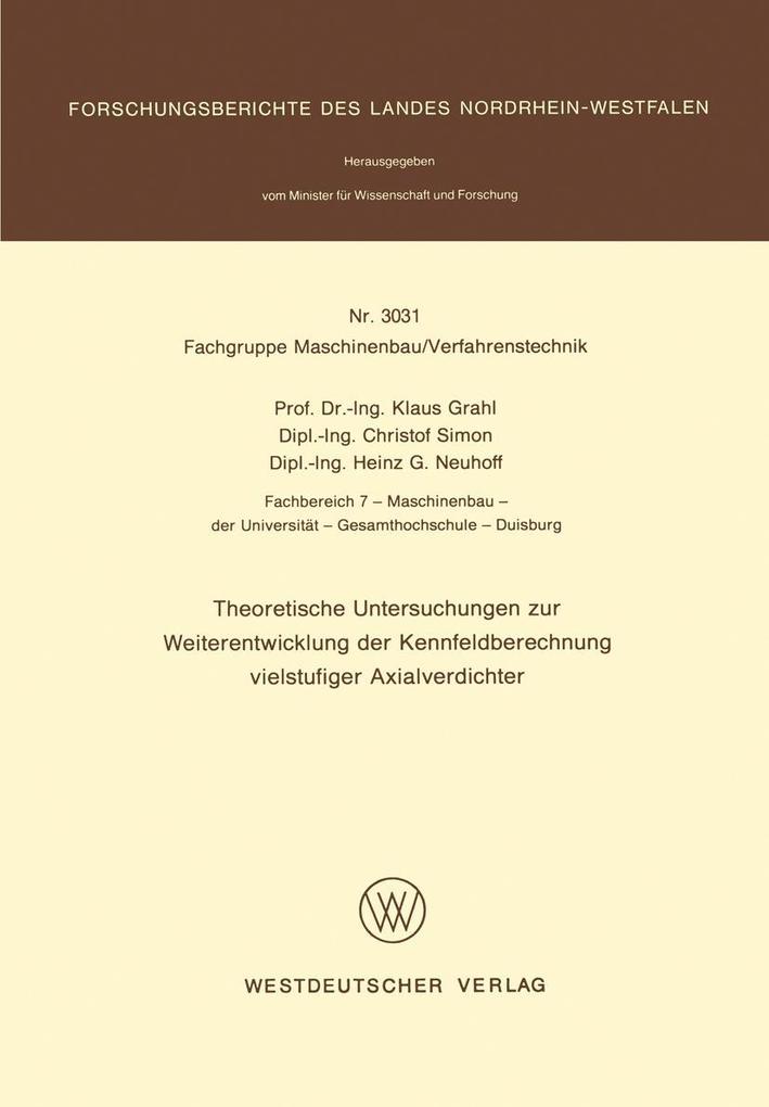 1. Einleitung. - Bezeichnungen. - 2. Physikalisch-mathematische Beschreibung des erweiterten Kennfeld berechnungsprogrammes. - 2. 1 Allgemeine Betrachtungen. - 2. 2 Ableitung der Differentialgleichung des radialen Gleichgewichtes. - 2. 3 Grenzschichttheorie nach Mellor. - 2. 4 Vergleich Messung Rechnung mit den Basis Werten für H, K und cf. - 3 Verbesserung des Kennfeldberechnungsverfahrens. - 3. 1 Erarbeitung eines Verlustmodells und Aufstellen der Sekundär- und Spaltströmungskorrelation. - 3. 2 Verbesserung der Güte des Verfahrens durch Einengung der Bereiche der frei wählbaren Konstanten cf, H und K. - 3. 3 Verlustverteilung über der Schaufelhöhe. - 3. 4 Theoretische Betrachtung des wichtigen praxisnahen Falles zusammengewachsener Seitenwandgrenzschichten bei Verdichtern mit hoher Stufenzahl. - 4 Bestimmung der Stabilitätsgrenze. - 4. 1 Anwendung der verbesserten Kennfeldrechnung. - 4. 2 Untersuchung des umlaufenden Abreißens. - 5. Theoretische Untersuchung des Einflusses der Eintrittsverdrängungsdicke und der radialen Spaltweite auf die Verdichterkennlinie. - 5. 1 Einfluß der Eintrittsverdrängungsdicke. - 5. 2 Einfluß der Spaltweite. - 6. Zusammenfassung und Ausblick. - 7. Literaturverzeichnis.