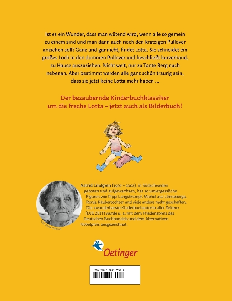 Jetzt auch als Bilderbuch: Astrid Lindgrens Lotta-Klassiker. Als Lotta aus der Krachmacherstraße eines Morgens den kratzigen Pullover von ihrer Oma anziehen soll, wird sie richtig wütend. Erst schneidet sie ein großes Loch in den Pullover, und dann beschließt sie kurzerhand, von zu Hause auszuziehen. Nicht weit allerdings, nur zu Tante Berg nach nebenan. Denn Lotta möchte natürlich sehen, wie traurig alle sind, wenn sie keine Lotta mehr haben. Die kleine Lotta ist eine von Astrid Lindgrens hinreißendsten und eigenwilligsten Kinderbuchheldinnen. Mit allen Originalillustrationen von Ilon Wikland.