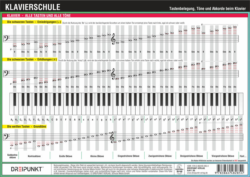 Beim Erlernen des Klavierspiels findet sich der Anfänger einer schier überwältigenden Zahl von Tasten ausgesetzt. Wo finde ich welchen Ton? Welche Tasten ergeben den gesuchten Akkord? Bevor Sie sich alle diese Informationen mühsam zusammensuchen, werfen Sie einen Blick auf unsere Info-Tafel. Hier finden Sie alle Infos, die Sie benötigen. Alle Tasten - alle Töne und dazu die wichtigsten Akkorde. Schnell - übersichtlich - haltbar: Durch die wasserfeste Laminierung ist die zweiseitige Info-Tafel unzerreißbar und langlebig.