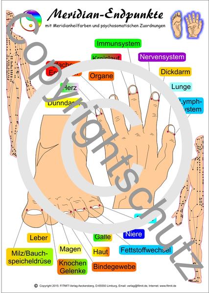 Die TCM (traditionelle chinesische Medizin) hat sich bei Heilung von Gesundheitsstörungen seit Jahrtausenden bewährt. Sie wird heute an Universitäten gelehrt und auch im Westen von Schulmediziner und Heilpraktiker erfolgreich angewendet. Meridianendpunkte befinden sich an den Fingern und Zehen kurz unter dem Nagelbett. Es sind kleine Energiezentren (Chakren) wo Energie aufgenommen und abgegeben wird.