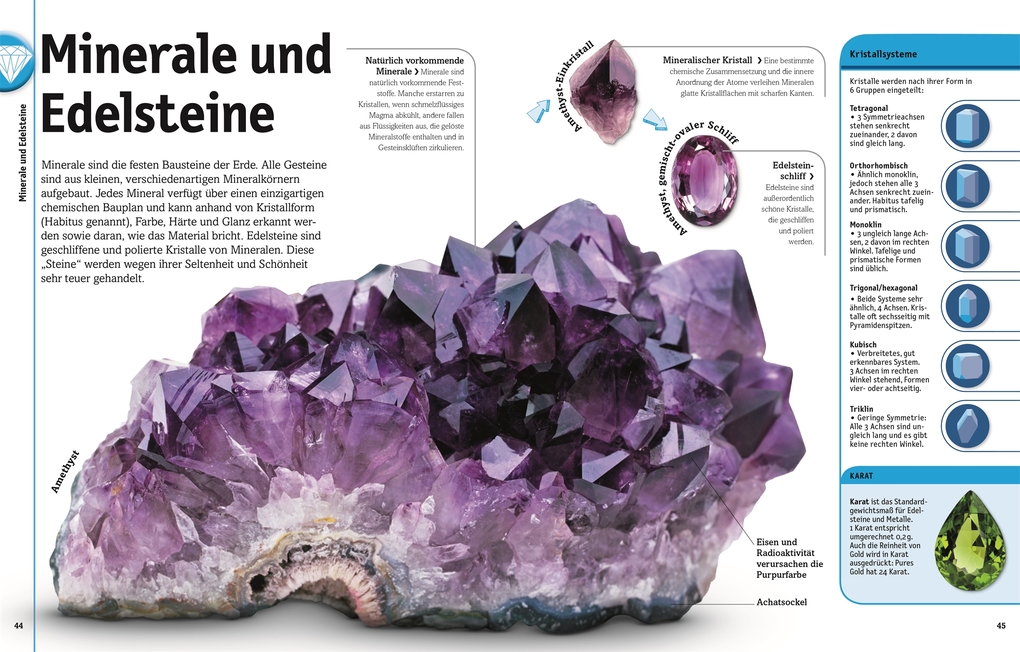 Jetzt wird's steinig! In über 1. 000 Farbfotos nimmt dieses Buch Gesteine, Minerale, Edelsteine und Fossilien genauestens unter die Lupe. Ob Sulfide, Oxide, Malachit oder Saphir - anschauliche Galerieseiten zeigen euch die ganze atemberaubende Vielfalt an Farben und Formen sowie beeindruckende Phänomene wie Vulkanexplosionen oder Höhlenmalereien. Lasst euch überraschen von der Schönheit der Steine und entdeckt die natürliche Schätze des Gesteinsplaneten Erde!
