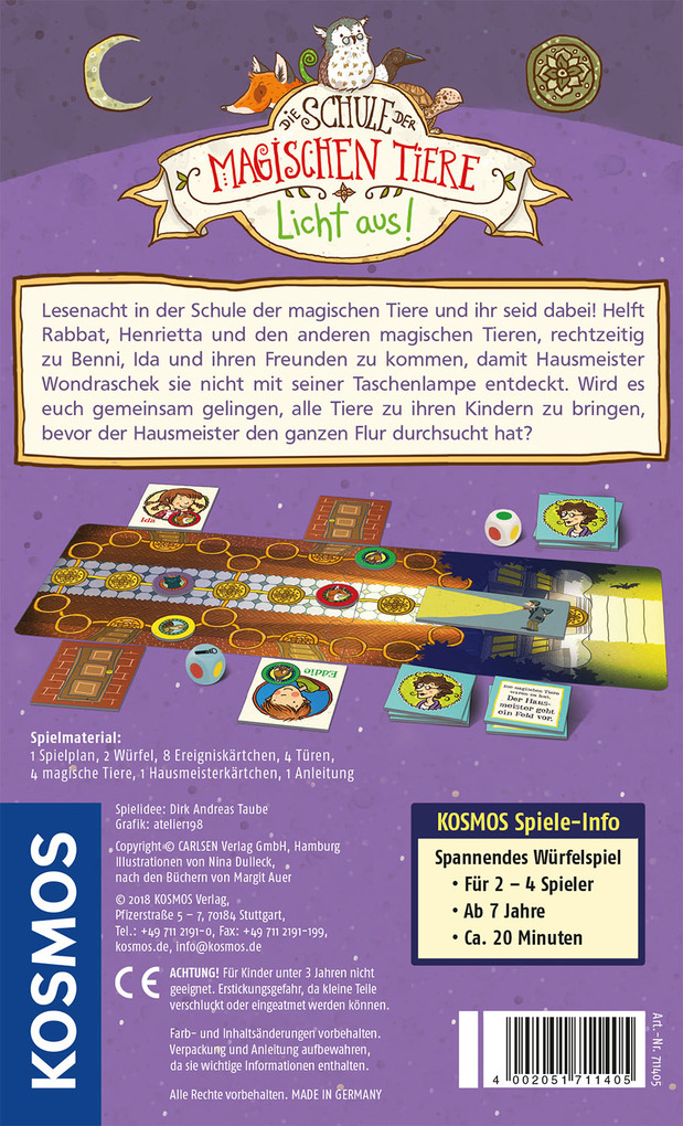 > Das kooperative Spiel zur erfolgreichen Buchreihe. Lesenacht in der Schule der magischen Tiere: Die Spieler helfen Rabbat, Henrietta und den anderen magischen Tieren rechtzeitig zu Benni, Ida und ihren Freunden zu kommen bevor Hausmeister Wondraschek sie mit seiner Taschenlampe entdeckt. Wird es den Spielern gemeinsam gelingen, alle Tiere rechtzeitig zu ihren Kindern zu bringen? © CARLSEN Verlag GmbH, Hamburg. Illustrationen von Nina Dulleck, nach den Büchern von Margit Auer. Für 2 - 4 Spieler ab 7 Jahren. Spieldauer: ca. 15 Minuten.