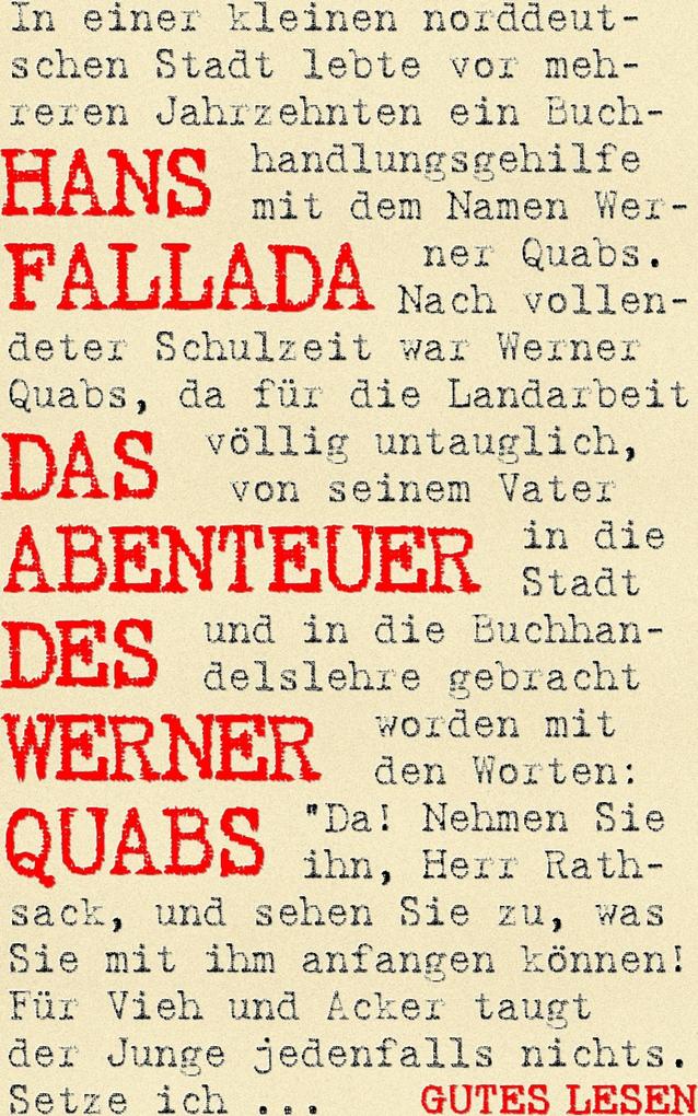 In einer kleinen norddeutschen Stadt lebte vor mehreren Jahrzehnten ein Buchhandlungsgehilfe mit dem Namen Werner Quabs. Nach vollendeter Schulzeit war Werner Quabs, da für die Landarbeit völlig untauglich, von seinem Vater in die Stadt und in die Buchhandelslehre gebracht worden mit den Worten: