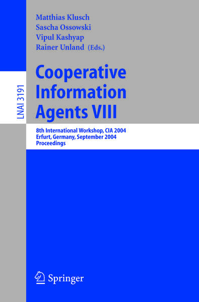 These are the proceedings of the 8th International Workshop on Cooperative Information Agents (CIA 2004), held at the Fair and Congress Center in - furt, Germany, September 27-29, 2004. It was part of the multi-conference Net. ObjectDays 2004, and, in particular, was co-located with the 2nd German Conference on Multiagent Systems Technologies (MATES 2004). In today's networked world of linked heterogeneous, pervasive computer systems, devices, and information landscapes, the intelligent coordination and provision of relevant added-value information at any time, anywhere, by means of cooperative information agents becomes increasingly important for a variety of applications. An information agent is a computational software entity that has access to one or multiple, heterogeneous, and geographically dispersed data and information sources. It proactively searches for and maintains information on behalf of its human users, or other agents, preferably just in time. In other words, itismanagingandovercomingthedi? cultiesassociatedwithinformation overload in open, pervasive information and service landscapes. Cooperative - formation agents may collaborate with each other to accomplish both individual and shared joint goals depending on the actual preferences of their users, b- getary constraints, and resources available. One major challenge of developing agent-based intelligent information systems in open environments is to balance the autonomy of networked data, information, and knowledge sources with the potential payo? of leveraging them using information agents. Interdisciplinaryresearchanddevelopmentofinformationagentsrequires- pertise in relevant domains of information retrieval, arti? cial intelligence, database systems, human-computer interaction, and Internet and Web techn- ogy.