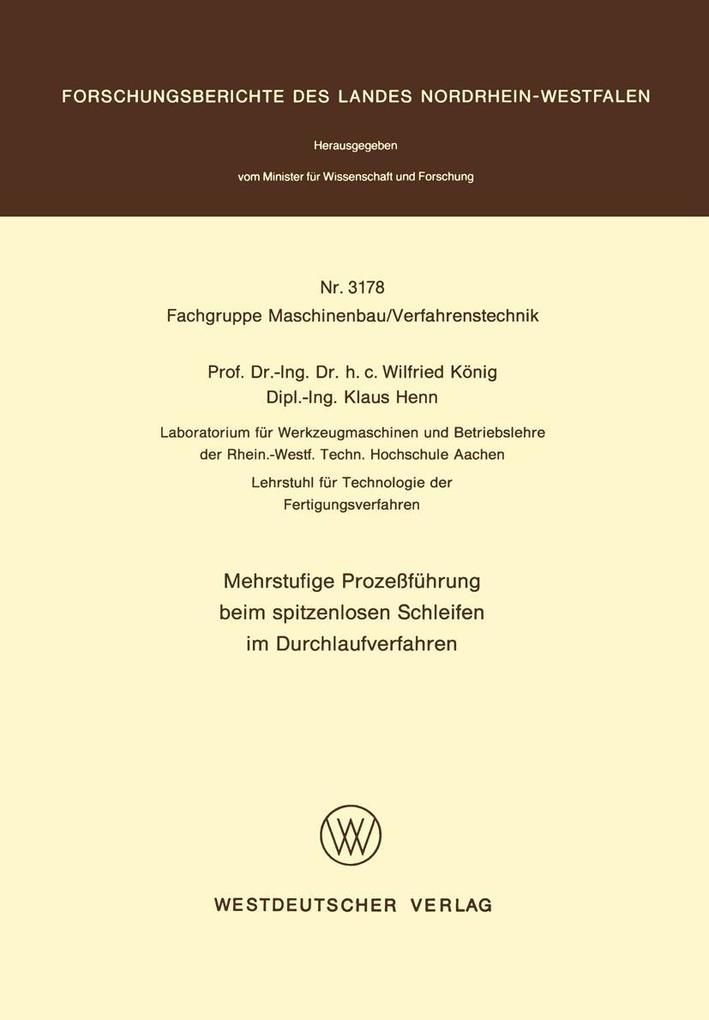 1. Einleitung. - 2. Kenngrößen des Verfahrens. - 3. Verschleiß. - 3. 1 Verschleißmechanismen und -formen. - 3. 2 Verschleißmeß- und -kenngrößen. - 3. 3 Bisherige Untersuchungen über das Schleifscheiben-verschleißverhalten beim spitzenlosen Durchlaufschleifen. - 3. 4 Verschleißentwicklung beim Außenrund-Umfang-Längsschleifen zwischen Spitzen. - 3. 5 Übertragung der Erkenntnisse auf das spitzenlose Durchlaufschleifen. - 4. Vor- und Randbedingungen der experimentellen Untersuchungen. - 4. 1 Versuchsmaschine und Meßmittel. - 4. 2 Gestaltung des Schleifspalts. - 4. 3 Verschleißmeßvorrichtung. - 5. Experimentelle Untersuchungen. - 5. 1 Verschleißentwicklung und Arbeitsergebnis bei einstufiger Prozeßführung. - 5. 2 Verschleißentwicklung und Arbeitsergebnis bei zweistufiger Prozeßführung. - 6. Entwicklung eines Rechenprogramms zur Ermittlung des Verschleißes und zeitlichen Änderung des Scheibenprofils. - 6. 1 Herleitung eines Verschleißmodells. - 6. 2 Herleitung eines Funktionsansatzes für die Verschleißberechnung. - 6. 3 Kopplung von Modell und Funktionsansatz. - 6. 4 Überprüfung der Ergebnisse des Rechenprogramms. - 7. Zusammenfassung. - 8. Literatur.