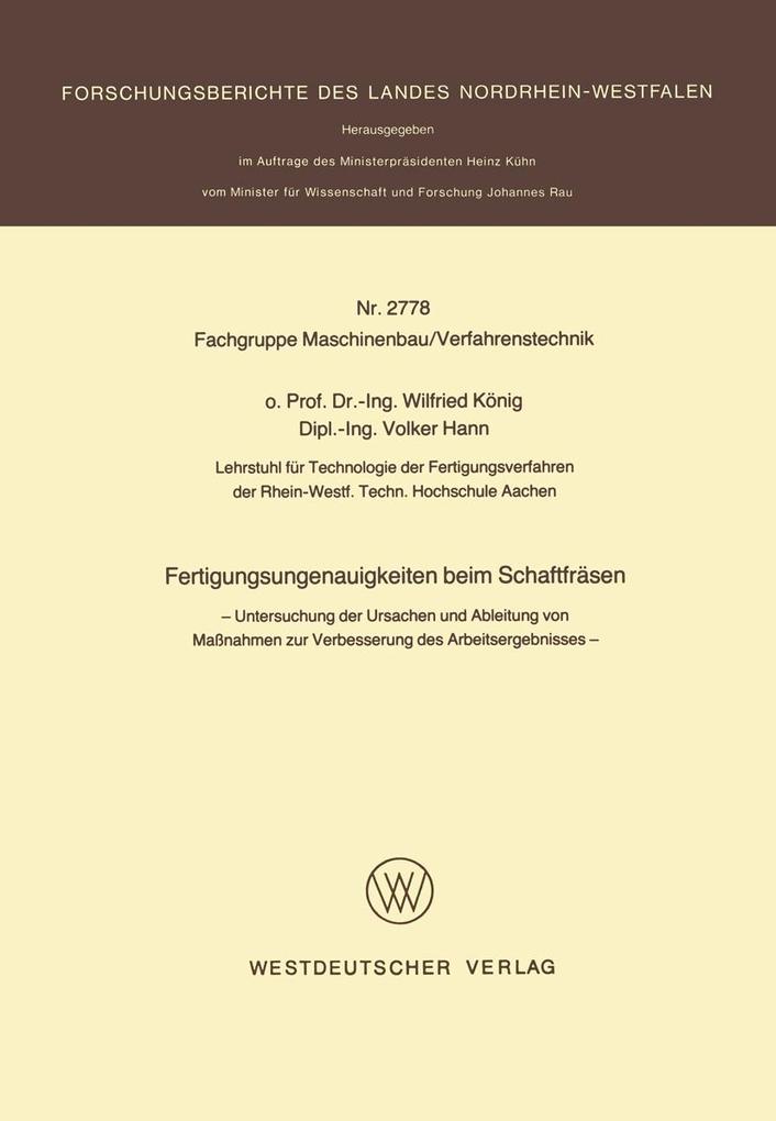 1. Einleitung und Problemstellung. - 2. Stand der Erkenntnisse. - 3. Analyse des Schaftfräsprozesses. - 3. 1 Analyse der Zerspankraft. - 3. 2 Messung der Wandprofile. - 3. 3 Rechnermodell zur Bestimmung des Wandprofils. - 3. 4 Zusammenfassung der Erkenntnisse aus Messung und Rechnung. - 4. Werkzeuge zur Erzeugung formoptimaler Wandprofile. - 5. Strategie zum Fräsen von Übergangsradien. - 6. Rundlauffehler und Spannmittelkonstruktion. - 6. 1 Darstellung und Auswirkung des Rundlauffehlers. - 6. 2 Gegenüberstellung verschiedener Spannmittel. - 6. 3 Weiterentwicklung eines neuen Schaftfräserspannfutters (Kompensationsfutter). - 6. 4 Meßvorrichtung zur berührungslosen Messung des Fräserrundlaufs. - 7. Zusammenfassung.