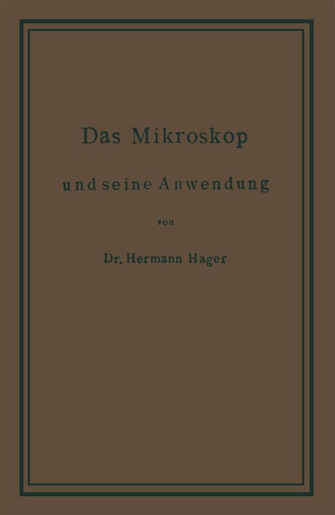 Das Mikroskop und Seine Anwendung. - Mikroskop, zusammengesetztes, was darunter verstanden wird. Linsen, Sammellinsen, Zerstreuungslinsen. - Brennpunkt (Focus), Brennweite (Fucaldistanz). - Seilwinkel. - Accommodationsverniögen des Auges. Deutliche Sehweite. - Vergrösserung eines Gegenstandes durch eine Sammellinse. - Lupe. Taschenlupe. Cÿlinderinpe. Stativlape. - Einfaches Mikroskop. - Spiegelmikroskop. Zusammengesetztes Mikroskop in seiner einfachen Zusammensetzung und seine Wirkung. - Einstellung, grobe, feine. Mikrometerschraube. - Aberration, sphärische. - Aberration, chromatische. - Doppellinse. - Doppellinse, überverbesserte, unterverbesserte, aplanatische. - Penetrircnde, resolvirende Kraft des Mikroskops. - Colleetivllnse, ihre Wirkung. - Objectiv. - Centrirung der Linsen. - Ocular, negatives, positives, orthoskopisches. - Linsensysteme, ihre Bezeichnung. Tubuslange. - Vergrösserungsmaass. - Beleuchtung des Objects. - Blendungen. - Drehscheibe. - Cylinderblenden. Condenser. - Mikrometer. Objectglasmikrometer. - Objectgläser. - Deckgläser. - Immersionsverfahren. - Compressorien, Schick s, Hager s Compressorium. - Klemmfeder. Zeichnenprisma. - Mikroskopmodelle. - Trommelmikroskope. - Taschenmikroskop. - Waechter s Universalmikroskop. - Hager s Compressor-Mikroskop. - Polarisationsmikroskop. - Stärkemehlkörnchen im polarisirten Lichte. - Das Mikroskop als saccharimetrisches Instrument. - Wasserlein s Polarisationsmikroskop. - Waechter s Polarisationsmikroskop. - Ankauf und Prüfung eines Mikroskops. - Probeobjecte. - Gebrauch des Mikroskops. - Luftbläschen und Röhren als mikroskopische Objecte. - Molecularbewegung. Moleculaiattractionsbewegung. - Flimmerbewegung. Pedesis. - Mouches volantes. Scotomata. - Reinigung der Mikroskope und ihrer Theile. - Darstellung mikroskopischer Objecte. -Präparirgeräthschaften. - Behandlung der Objecte. - Färbung der Objecte. Fuchsinlösung. - Aufbewahrung der Objecte. - Conservationsflüssigkeiten. - Objecthalter. - Flüssiger Leim. - Lacke, Firnisse. - Mikroskopische Objecte. - Die Zelle. Pflanzengewebe. - Mehl. Stärkemehlkörnchen. - Kleberkörnchen. - Mutterkornpilz. - Erkennung im Mehle. - Flugbrand. - Schmierbrand. - Arrow-root, Marantastärke. - Getreiderost. Grasrost. - Mehlmilbe, Weizenschlängelchen. - Kartoffelpilz. - Weintraubenpilz. - Schimmel, Schimmelpilze. - Gespinnstfasern. - Haare. - Gewürze, Pfeffer, Piment, Gewürznelken, Zimmt, Senf, Santelholz, Curcuma. - Senf, Mostrich. - Cacao, Chocolade. - Kaffee, Cichorienkaffee etc. . - Thee. - Honig. - Blut, Blutkörperchen, Wanderzelle. - Haematin, Haemoglobin, Haemin, Haeminkrystalle, Haematinhydrochloridkrystalle. - Blutflecke. - Bacterien. Mikrophyten, Urthierchen. - Spirillen, Fadenbacterien. - Kommabacillen. Heupilz. - Tuberkelbacillen. - Sputum, tuberculöses. - Färbung der Tuberkelbacillen. - Diphtheritispilz. - Sarcinien, Magensarcinie. - Kopfgrind, Favuspilz. - Soorpilz. Zungenbelegpilz. Vibrionen, Oscillarien. - Vibrionen. - Fermentpilze, Gährpilze. - Diatomaceen. - Schleim. Eiter. - Sputum bei Lungenkatarrh. - Lymphkörperchen. - Milch. - Butter. Margarinbutter. - Harn (Urin). - Samenfädchen. Flimmerzellen. Cercomonaden. - Parasiten des thierischen Körpers. - Kerfmilben. Erntemilbe. Vogelmilbe. - Haarsackmilbe. Hackenträger. - Krätzmilbe. - Trichinen. - Fleischobject. - Ollulane. - Kappenwurm. - Miescher sche Körperchen, Psorospemien. - Ochsenstrahlpilz. - Hager s Präparirmikroskop. - Waechter s Fleischschaumikroskop. - Schweinefinne. Bandwurm. - Räderthierch en. - Reblaus. - Weinstockpilze. Weinstockmilben.