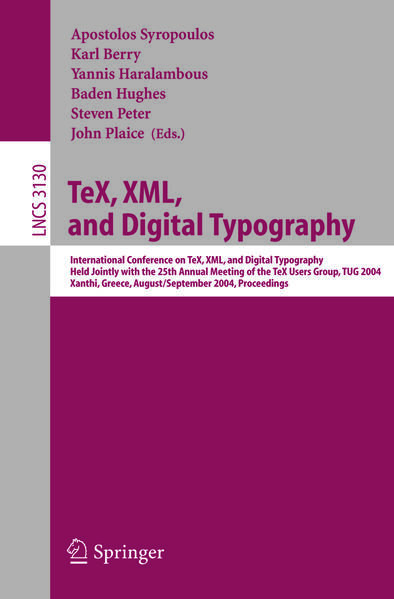 Digital Typography in the New Millennium: Flexible Documents by a Flexible Engine. - Moving ? to an Object-Oriented Platform. - Basque: A Case Study in Generalizing LaTeX Language Support. - ? o ? o 2 ? o ? ? : Java-Based Conversion of Monotonic to Polytonic Greek. - Using LaTeX to Typeset a Mar? th? -English Dictionary. - Hyphenation Patterns for Ancient and Modern Greek. - Typesetting the Deseret Alphabet with LaTeX and metafont. - featpost and a Review of 3D metapost Packages. - Interactive Editing of MathML Markup Using TeX Syntax. - Typesetting CJK Languages with ? . - Dynamic Arabic Mathematical Fonts. - Arabic Mathematical e-Documents. - Migrating to XML: The Case of the GUST Bulletin Archive. - Animations in pdfTeX-Generated PDF. - iTeXMac: An Integrated TeX Environment for Mac OS X. - MlBibTeX: Beyond LaTeX. - Managing TeX Resources with XML Topic Maps. - ? äferTeX: Source Code Esthetics for Automated Typesetting. - Creating Type 1 Fonts from metafont Sources. - Beyond Glyphs, Advanced Typographic Features of Fonts.