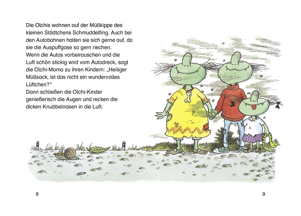 Die Olchis sind, wie man mit einem Blick erkennen kann, ganz besonders liebreizende Geschöpfe. Sie leben in der Nähe von Müllbergen und Abfallgruben, verströmen einen entsprechenden Geruch und sind immer von Fliegenschwärmen umgeben. Sie ernähren sich von Blechbüchsen, Autoreifen und Haarschampoo und sind so stinkefaul, dass sie die meiste Zeit in der Sonne verdösen. Bis sie vor lauter Nichtstun auf die verrücktesten Ideen kommen. . .