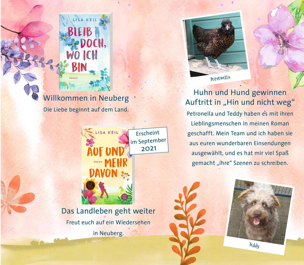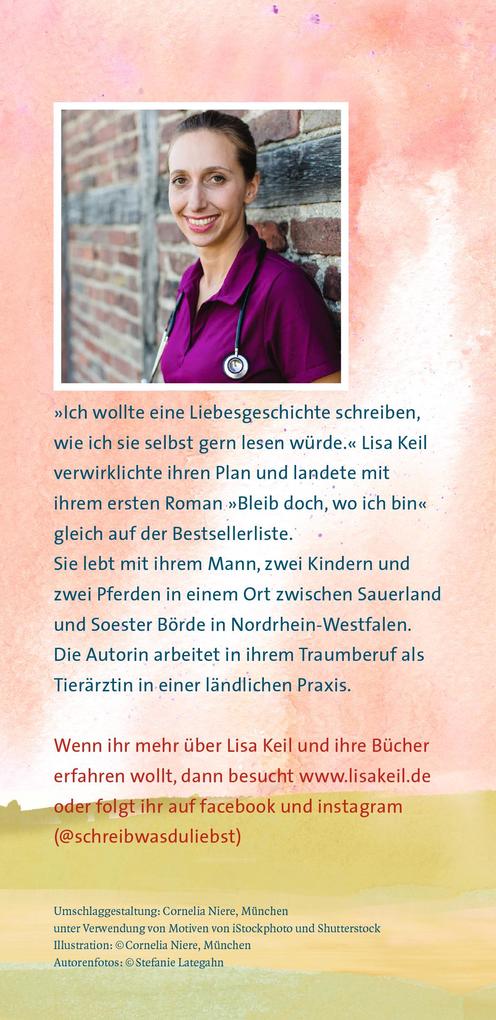 Das Buch ist ein wunderschöner Wohlfühlroman, der aber nichts beschönigt und auch ein bisschen nachdenklich macht. Obwohl man ihn theoretisch auch ohne Vorkenntnisse verstehen kann, empfehle ich zuerst Bleib doch, wo ich bin zu lesen. Ich freue mich jetzt schon auf den nächsten Roman der schreibenden Tierärztin Lisa Keil und hoffe, dass es noch viele weitere Bücher von ihr geben wird.