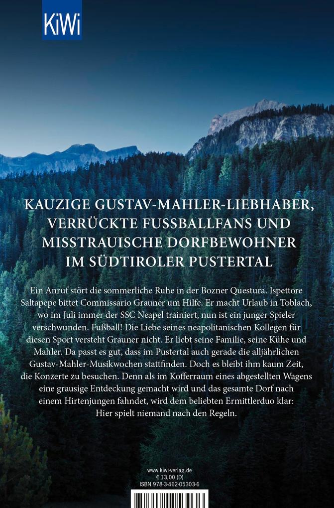 Ein Anruf stört die sommerliche Ruhe in der Bozner Questura. Ispettore Saltapepe, der gerade in Toblach Urlaub macht, bittet Commissario Grauner um Hilfe: In dem Ort, in dem im Juli immer der SSC Neapel trainiert, sei ein junger Spieler verschwunden. Nichts findet der Commissario langweiliger als Fußball. Er interessiert sich für Kühe. Und für klassische Musik - da passt es gut, dass im Pustertal gerade die alljährlichen Gustav-Mahler-Musikwochen stattfinden.