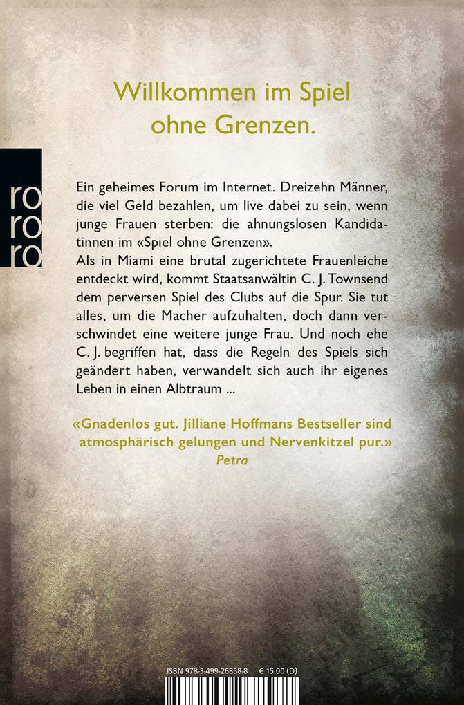 Ein geheimes Forum im Internet. Dreizehn Männer, die viel Geld bezahlen, um live dabei zu sein, wenn junge Frauen sterben: die ahnungslosen Kandidatinnen im «Spiel ohne Grenzen». Als in Miami eine brutal zugerichtete Frauenleiche entdeckt wird, kommt Staatsanwältin C. J. Townsend dem perversen Spiel des Clubs auf die Spur. Sie tut alles, um die Macher aufzuhalten, doch dann verschwindet eine weitere junge Frau. Und noch ehe C. J. begriffen hat, dass die Regeln des Spiels sich geändert haben, verwandelt sich auch ihr eigenes Leben in einen Albtraum . . .