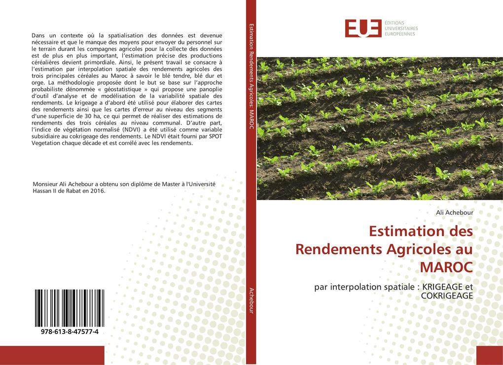 Dans un contexte où la spatialisation des données est devenue nécessaire et que le manque des moyens pour envoyer du personnel sur le terrain durant les compagnes agricoles pour la collecte des données est de plus en plus important, l'estimation précise des productions céréalières devient primordiale. Ainsi, le présent travail se consacre à l'estimation par interpolation spatiale des rendements agricoles des trois principales céréales au Maroc à savoir le blé tendre, blé dur et orge. La méthodologie proposée dont le but se base sur l'approche probabiliste dénommée ' géostatistique ' qui propose une panoplie d'outil d'analyse et de modélisation de la variabilité spatiale des rendements. Le krigeage a d'abord été utilisé pour élaborer des cartes des rendements ainsi que les cartes d'erreur au niveau des segments d'une superficie de 30 ha, ce qui permet de réaliser des estimations de rendements des trois céréales au niveau communal. D'autre part, l'indice de végétation normalisé (NDVI) a été utilisé comme variable subsidiaire au cokrigeage des rendements. Le NDVI était fourni par SPOT Vegetation chaque décade et est corrélé avec les rendements.