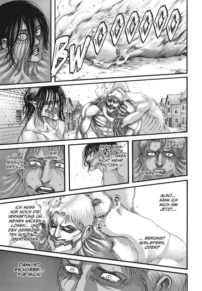 Zeke hat Eren seinen Plan anvertraut, der in einer Zwangssterilisierung aller Eldia enden soll. Der Schlüssel zur Durchführung des Plans ist eine direkte Berührung von Eren, der die Kräfte des Urtitanen besitzt, und Zeke, der ein Titan königlichen Geblüts ist. Und tatsächlich gelingt es Zeke, sich aus dem Belagerungsnetz von Levi und dem Aufklärungstrupp zu befreien. Aber dann taucht die Armee von Marley auf. Ob Eren und Zeke es schaffen, sich zu berühren?