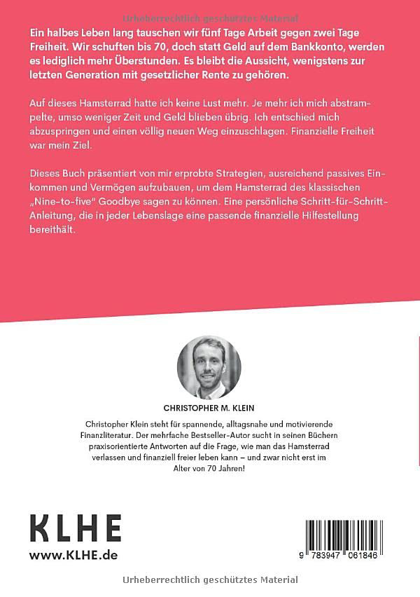 " Die große Finanzlüge, finanzielle Freiheit für Gering- und Normalverdiener sei eine Utopie, wird in diesem Buch meisterlich enttarnt! " Dieses Buch ist alles, was Du für Deine finanzielle Zukunft jemals brauchen wirst! . 40 bis 50 Jahre arbeiten, um am Ende auf eine immer mickriger werdende Rente zu hoffen. Das ist in unserem Kulturkreis der herrschende Leitgedanke. Wir begeben uns dafür in ein Hamsterrad, das sich im Laufe der Zeit immer weiter beschleunigt. Ein halbes Leben lang tauschen wir 5 Tage Arbeit gegen 2 Tage Freiheit . Es fehlt schlicht und einfach an der alles entscheidenden Geldbildung . Nicht wissend, werden wir in die Zwänge des Hamsterrads gesogen. Und je mehr wir uns darin abstrampeln, umso weniger Zeit und Geld scheint für uns dabei herumzukommen.