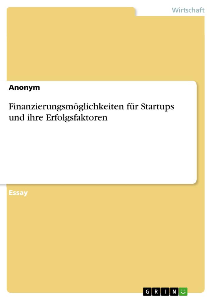 Essay aus dem Jahr 2020 im Fachbereich BWL - Investition und Finanzierung, Note: 1, 3, FOM Essen, Hochschule für Oekonomie & Management gemeinnützige GmbH, Hochschulleitung Essen früher Fachhochschule, Sprache: Deutsch, Abstract: Das Ziel der Arbeit ist es, einen Überblick über die verschiedenen Finanzierungsmöglichkeiten für Startup-Unternehmen aufzuzeigen. Außerdem soll gezeigt werden, wie sich Startups unkonventionell finanzieren lassen und welche Faktoren den Erfolg von Startups bestimmen.