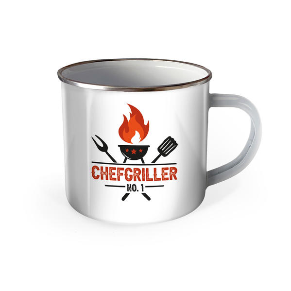 ROBUSTE EMAILLETASSE, bedruckt mit Text "Chefgriller NO. 1" HOHE FARBBRILLIANZ, Größe Ø 8 cm x H 8 cm, Fassungsvermögen ca. 300 ml, Handwäsche empfohlen LIEBEVOLL HERGESTELLT: Die Tassen werden von uns gestaltet und in Handarbeit bedruckt. Die Qualität jeder einzelnen Tasse wird somit von uns kontrolliert und garantiert! DIE GESCHENKIDEE für alle selbsternannten Grillmeister