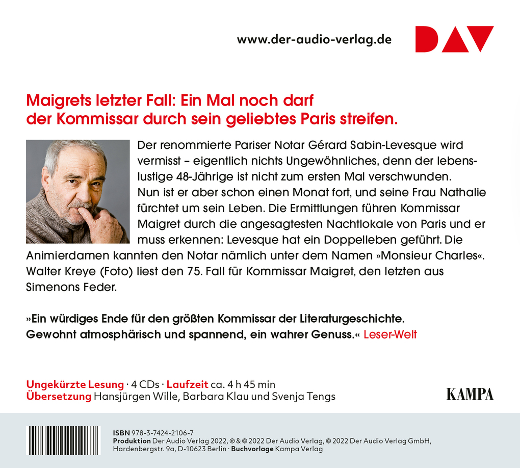 Georges Simenon (* 13. Februar 1903 in Lüttich 4. September 1989 in Lausanne) gilt als der »meistgelesene, meistübersetzte, meistverfilmte, in einem Wort: der erfolgreichste Schriftsteller des 20. Jahrhunderts« (Die Zeit). Das bedeutende Werk des manischen Schreibers umfasst 75 Maigret-Romane, 117 weitere Romane und über 150 Erzählungen. Mit seinem schnörkellosen Stil und seiner Sensibilität für Atmosphäre gewann Simenon zahlreiche berühmte Bewunderer, darunter Winston Churchill und Ferdinand von Schirach.