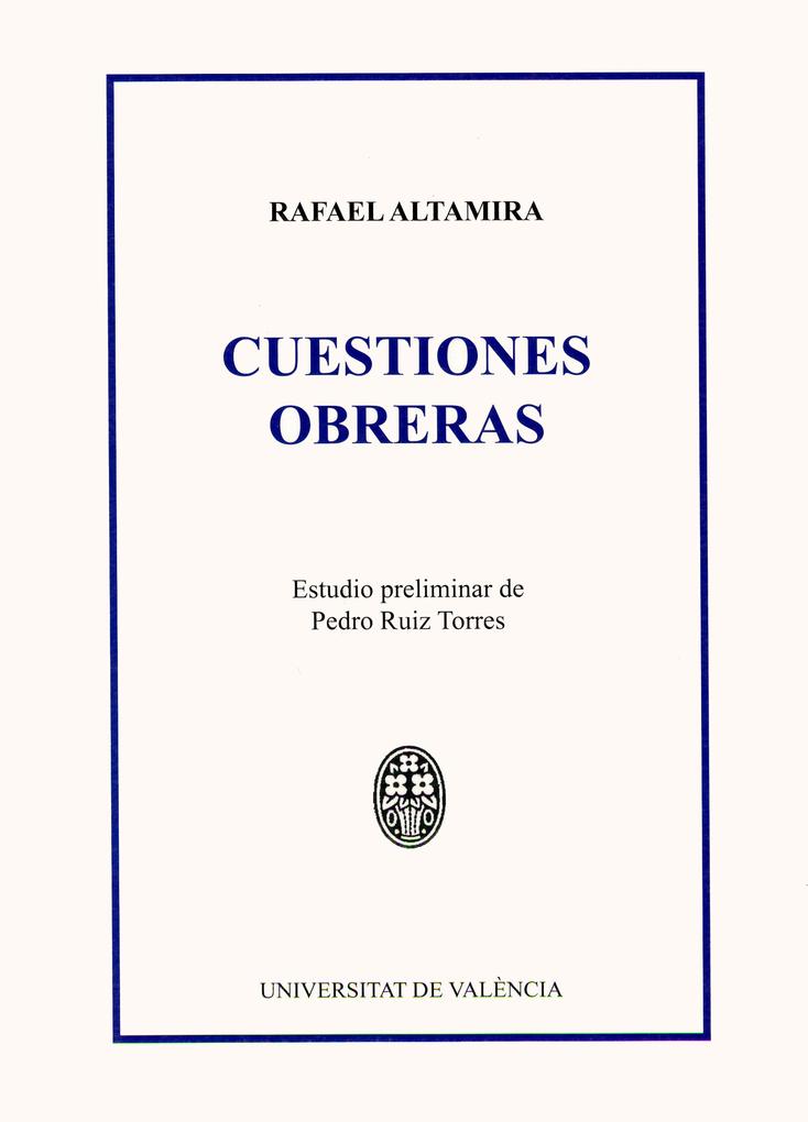 Desde principios del siglo XX y hasta poco antes del estallido de la Gran Guerra en junio de 1914, Rafael Altamira redactó numerosos escritos de temática «obrera», una buena muestra de los cuales, debidamente ordenados y clasificados, recopiló en el libro titulado Cuestiones obreras. En conjunto, los escritos de Altamira recibían la denominación de «cuestiones obreras». Al obrero como tal y como hombre no sólo le importaban cosas relativas a las relaciones entre el capital y el trabajo. Así, a esas otras cuestiones, en plural, que no son menos sociales que las económicas, nos dice Altamira, se refiere el presente libro, que abarca un amplio abanico de temas relacionados con la difusión popular de la cultura y los enfoques éticos y jurídicos del denominado «problema obrero».