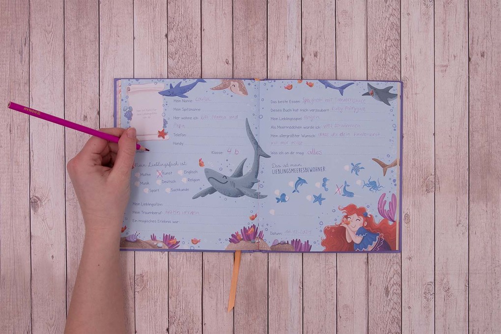 Freundebuch für SchulkinderÜber dieses Freundebuch freuen sich alle Meermädchen-Fans, denn die Klapp-Wechselcover sind ein echter Hingucker. Auf vielen verschiedenen Seiten können sich Freund*innen aus der Schule eintragen. Außerdem gibt es einen Geburtstagskalender und jede Menge Platz für persönliche Freundschaftssprüche und Fotos. So bleiben Freundinnen und Freunde für immer in Erinnerung!