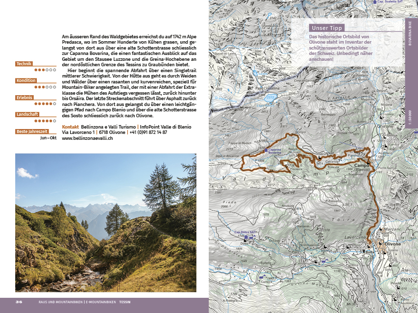Bikeführer mit aussergewöhnlichen Mountainbike- und E-Mountainbike-Touren Dieser Bikeführer ist die perfekte Inspiration für die Planung der nächsten Touren. Er beschreibt offiziell homologierte Biketouren und Flowtrails. Inspirierende Bilder, kombiniert mit übersichtlichen Informationen der Touren bezüglich Schwierigkeitsgrade in Technik und Kondition. Ausprägungen in den Faktoren Erlebnis und Landschaft werden abgerundet mit einem Höhenprofil. Der Verlauf der Tour wird in einer Detailkarte dargestellt. Zusatzinformationen über besonders für E-MTB geeignete Touren, sowie Singeltrails und die Erreichbarkeit der Touren machen grosse Vorfreude auf ein unvergessliches Raus-Erlebnis.