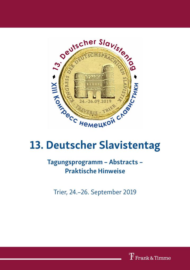 Der vorliegende Band enthält das Programm und die Abstracts der Vorträge des 13. Deutschen Slavistentages in Trier (24. -26. 09. 2019). Beim Deutschen Slavistentag handelt es sich um den Kongress der deutschsprachigen Slavistik, der seit 1964 alle drei bis vier Jahre an einer Universität mit slavistischem Institut stattfindet. Auf dem Slavistentag in Gießen 2015 wurde die Austragung des nächsten Slavistentages für 2019 an den FB II: Slavistik der Universität Trier vergeben. Das Organisationsteam des 13. Deutschen Slavistentages in Trier lud alle promovierten Slavistinnen und Slavisten sowie die Promovierenden im Fach Slavistik aus Deutschland, Österreich und der Schweiz als auch deutschsprachige Kolleginnen und Kollegen aus dem weiteren europäischen Ausland und den USA zur Teilnahme ein. Die Einladung zum Slavistentag 2019 fand großen Zuspruch, der sich in 375 Anmeldungen widerspiegelte. Auf dem Slavistentag legen die Forscherinnen und Forscher der Öffentlichkeit Rechenschaft über ihre Tätigkeit ab, sie stellen aktuelle Forschungen vor und diskutieren wichtige Entwicklungen des Faches. Die Themen der Vorträge in den 16 Sektionen und den besonders stark repräsentierten 26 thematischen Panels umfassen die ganze Bandbreite der Forschungen im Bereich der slavistischen Sprach-, Literatur- und Kulturwissenschaft sowie der Didaktik slavischer Sprachen.