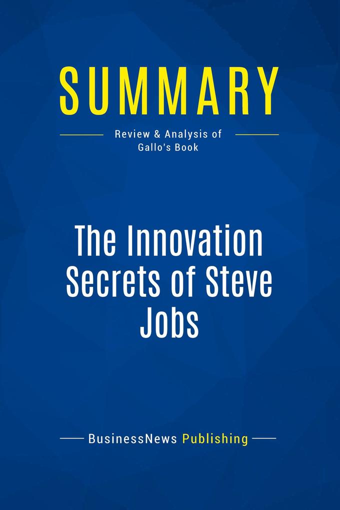 This complete summary of the ideas from Carmine Gallo's book "The Innovation Secrets of Steve Jobs" talks about Steve Jobs, co-founder and CEO of Apple, the electronic powerhouse. Steve Jobs is widely regarded as one of the most successful innovators in history and Gallo shows in his book how he pulls that off. For one thing, he doesn t believe that a rigid step-by-step method exists for innovation. Nor do Apple employees attend classes or seminars on "How to innovate". Instead, Steve Jobs has achieved genuine breakthrough success by applying seven general principles. This summary highlights those seven principles: 1. Do what you love; 2. Aspire to change the world; 3. Kick-start your brain; 4. Sell dreams, not products; 5. Say no to the unnecessary; 6. Create insanely great experiences; 7. Master delivering the message.