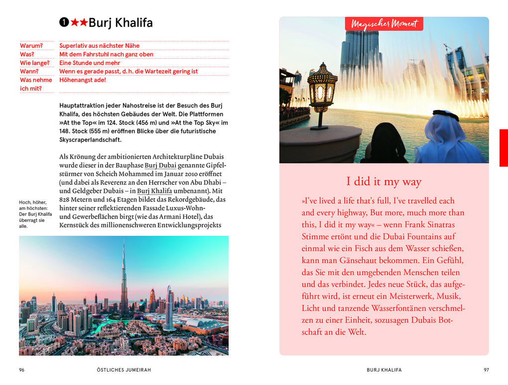 Größer, höher, atemberaubender - die Stadt der Superlative kennt keine Grenzen. Wer nach Dubai reist, kommt aus dem Staunen so schnell nicht wieder heraus. Von den Extremen des Burj Khalifa oder der Dubai Mall bis zum Blumenmeer des Dubai Miracle Garden und dem wohl berühmtesten Hotel Burj Al Arab hat das Emirat einiges zu bieten. Hier erleben Sie das Besondere, finden einzigartige Phänomene wie »Ski Dubai« und bekommen sogar einen Einblick in die Zukunft.