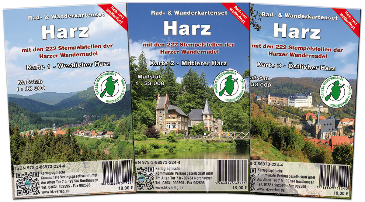 Der Harz, dass höchste Mittelgebirge Norddeutschlands, liegt am Schnittpunkt von Niedersachsen, Sachsen-Anhalt und Thüringen. Das beliebte Urlaubsgebiet mit dem 1141 m hohen "Brocken" hat neben einer Vielzahl von Wanderwegen und Radwegen für alle Interessen etwas zu bieten. Besonders die 222 Stempelstellen der Harzer Wandernadel bieten dem Wanderer die Möglichkeit, die schönsten und abwechslungsreichsten Naturschönheiten, die romantischsten Klippen- und Felsformationen und die interessantesten Sehenswürdigkeiten zu entdecken und zusätzlich ein Wanderabzeichen in unterschiedlichen Leistungsstufen zu erwerben. Das neue Kartenset der Harzes stellt auf 3 reiß- und wetterfesten Detailwanderkarten den Harz mit den 222 Stempelstellen der Harzer Wandernadel und dem vollständigen Rad- und Wanderwegenetz im Maßstab 1:33 000 vor. Darüber hinaus werden auch die 25 neuen Stempelstellen entlang des Karstwanderweges in den Karten dargestellt. Die detaillierte Darstellung der Rad- und Wanderwege zusammen mit den Stempelstellen erleichtert die individuelle Planung der Wanderung und natürlich das Wandern zu den Stempelstellen. Auf jeder Karte sind die eingezeichneten Stempelstellen mit Ihrem Suchregister aufgelistet und eine Legende erläutert die wichtigsten Symbole und Wanderwege. Ein UTM-Gitter ermöglicht die Nutzung eines GPS Gerätes und die integrierte Geländeschummerung visualisiert das Mittelgebirge.