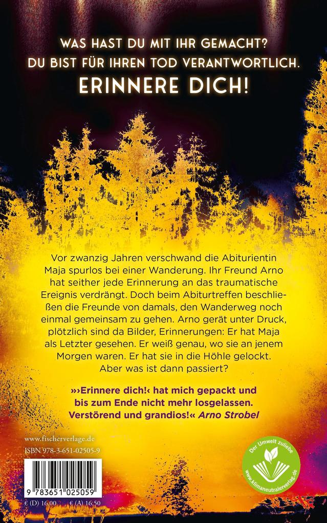 Arno Seitz bekommt über ein Wegwerfhandy seltsame Nachrichten und Anrufe, die ihn auffordern, sich zu erinnern. Es geht um eine Wanderung von vor zwanzig Jahren, bei der seine große Liebe Maja spurlos verschwunden ist. Bis heute ist nicht geklärt, was damals geschah. Arno traut sich selbst nicht mehr und diverse Ereignisse, nicht zuletzt das Abiturtreffen und die dort auftauchende Anja, Majas kleine Schwester, lösen erschreckende Erinnerungen aus.