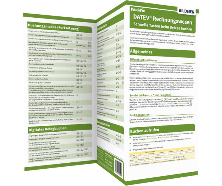 Egal ob in der Buchungsmaske, Buchungsansicht, Programmbedienung oder beim Navigieren - ab sofort haben Sie immer die richtige Tastenkombination in DATEV Rechnungswesen zur Hand! Auf 6 übersichtlich gestalteten Seiten finden Sie die praktischen Tastenkürzel auf einen Blick!