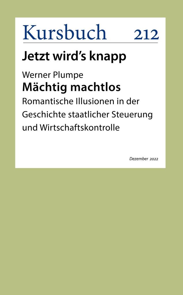 Das Kursbuch 212 beschäftigt sich mit der Frage, wie der Umgang mit knappen Gütern beziehungsweise mit Knappheit vor sich geht. Werner Plumpe untersucht in seinem Beitrag historisch und systematisch die Steuerungskapazitäten des Staates und setzt sich mit der Illusion auseinander, der Staat könnte schon angemessene Steuerungskapazitäten dem Wirtschaftsgeschehen gegenüber übernehmen, wenn er nur wollte. Er nennt dies eine romantische Illusion, die sich am Ende an einer Gesellschaft bricht, die sich solchen Steuerungsansprüchen entzieht.