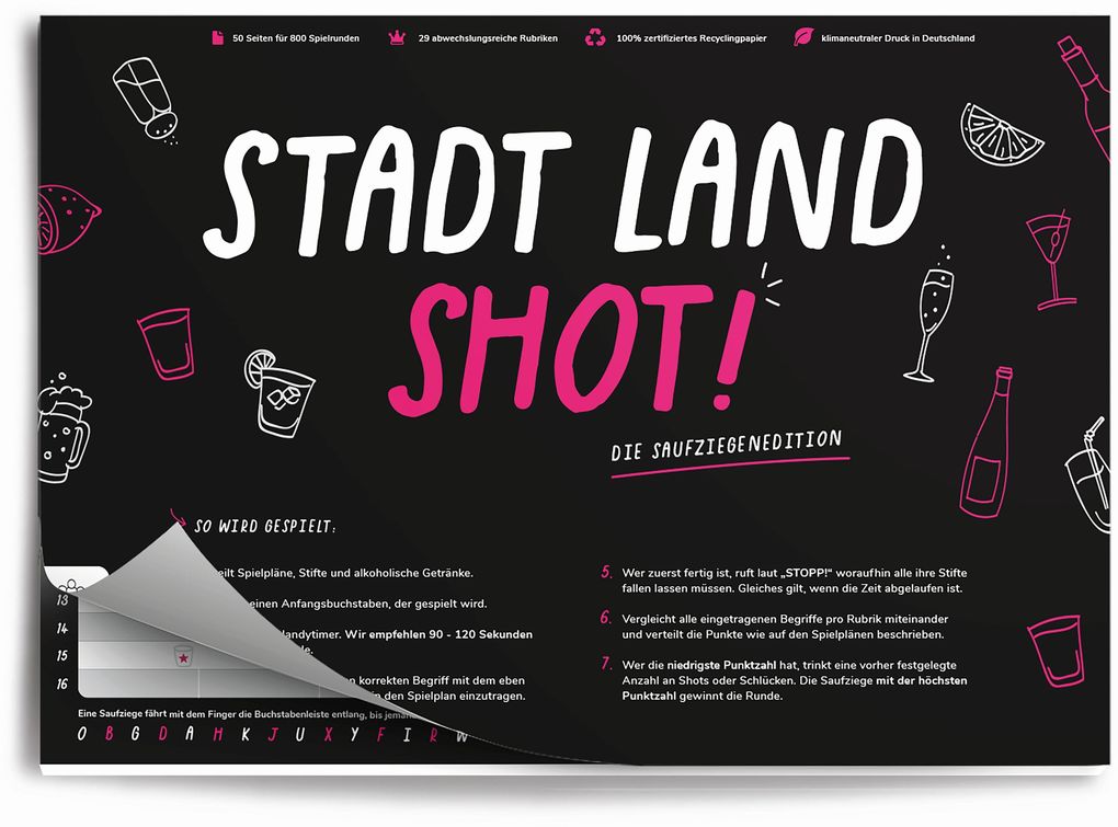 Den Spieleklassiker Stadt Land Fluss kennt wohl jeder. In der Trinkspielvariante STADT LAND SHOT geht es feucht-fröhlich her. Hierfür gibt es abwechslungsreiche Kategorien, die hervorragend zu allen Saufziegen passen und Sonderfelder für noch mehr Dynamik am Spieltisch. Enthält: 1x A4 Block mit 50 Blatt.