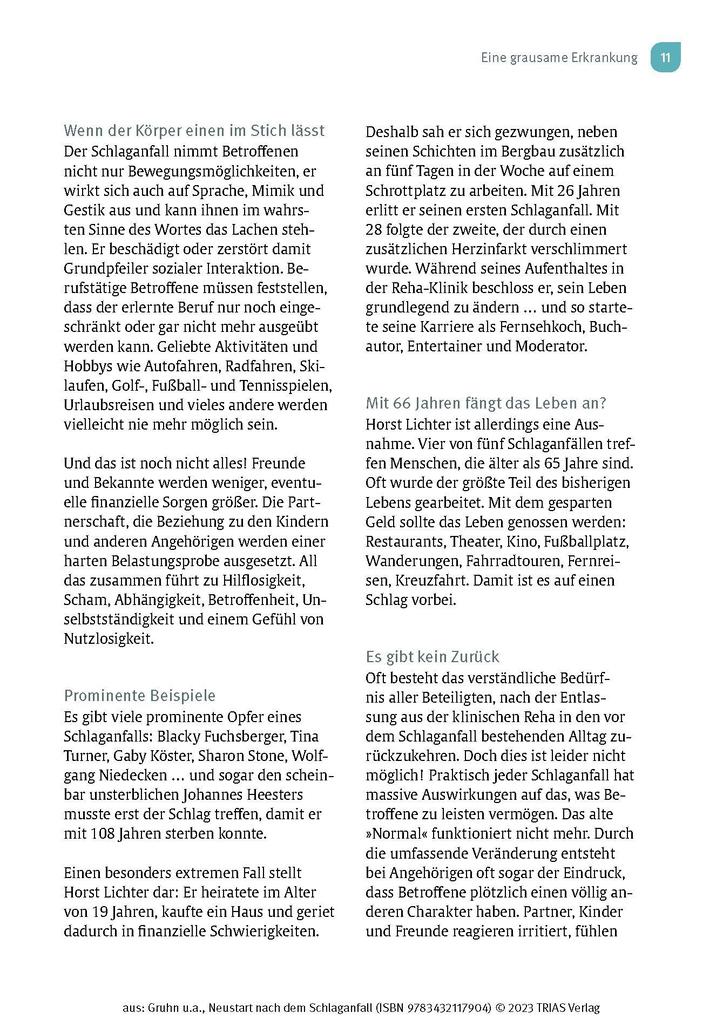 Der Physiotherapeut Helmut Gruhn hat sich in den letzten 30 Jahren auf die Behandlung von Schlaganfall-Patienten spezialisiert. Er ist Bobath-Instruktor und entwickelte das Therapiekonzept Back-to-Life , um Schlaganfall-Betroffenen einen aktiven, selbstbestimmten Alltag zu ermöglichen. Im Jahr 2004 gründete er das Perzeptionshaus in Hainburg. Er leitet Fortbildungen und Seminare für Therapeuten und Ärzte und war als Supervisor in verschiedenen neurologischen Kliniken tätig. Auf Kongressen und Messen sowie in Schlaganfall-Selbsthilfegruppen tritt er als Referent und Impulsgeber auf. Im Jahr 2022 wurde er mit dem Motivationspreis der Stiftung Deutsche Schlaganfall-Hilfe ausgezeichnet.