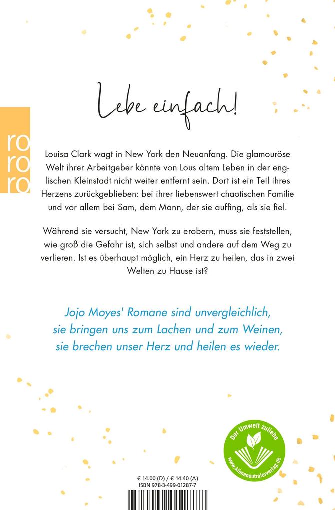 Die glamouröse Welt ihrer Arbeitgeber könnte von Lous altem Leben in der englischen Kleinstadt nicht weiter entfernt sein. Dort ist ein Teil ihres Herzens zurückgeblieben: bei ihrer liebenswert chaotischen Familie und vor allem bei Sam, dem Mann, der sie auffing, als sie fiel.