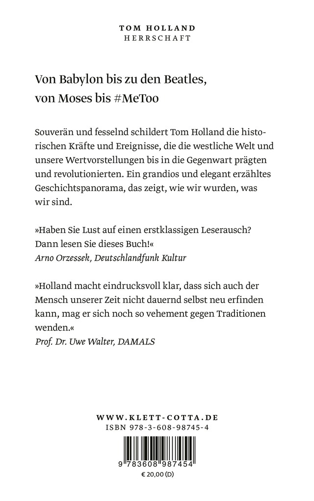 »Ein superinteressantes Buch von dem tollen englischen Historiker Tom Holland, in welchem er die Geschichte des Westens als Geschichte der permanenten Revolution der Christenheit gegen sich selber beschreibt. Sehr gut geschrieben. « Claudius Seidl, RBB