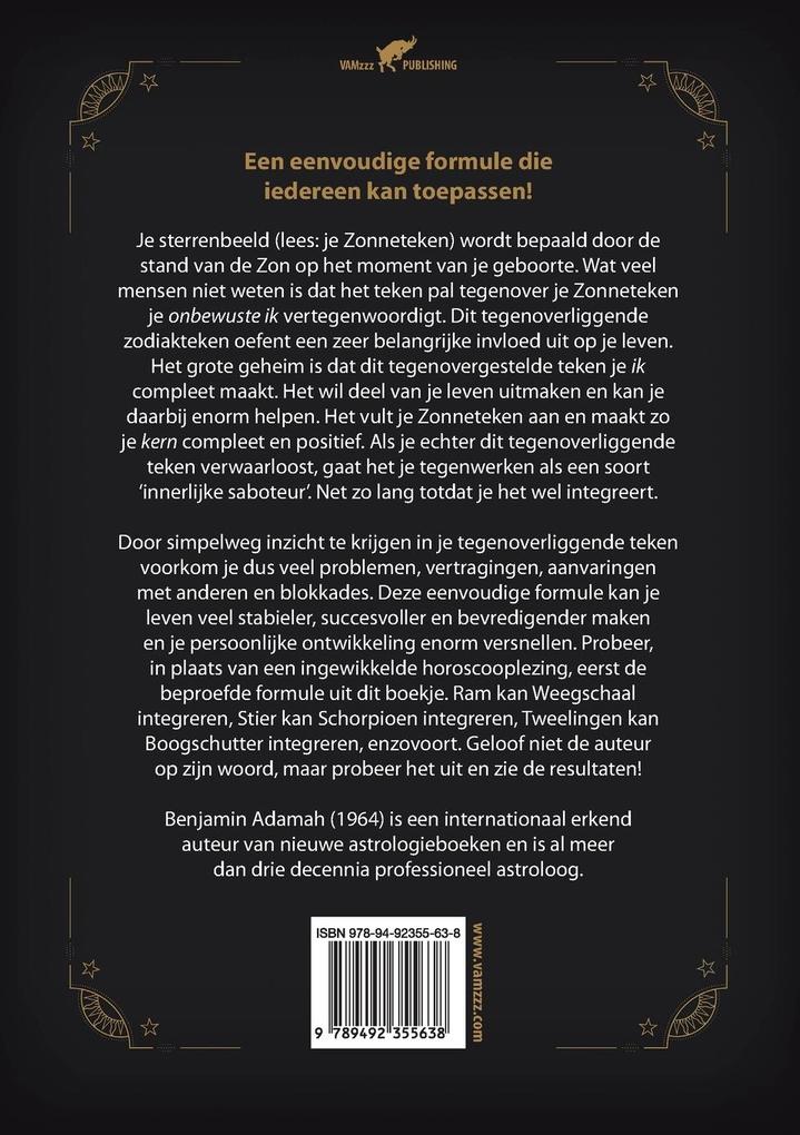 Door simpelweg inzicht te krijgen in je tegenoverliggende teken voorkom je dus veel problemen, vertragingen, aanvaringen met anderen en blokkades. Deze eenvoudige formule kan je leven veel stabieler, succesvoller en bevredigender maken en je persoonlijke ontwikkeling enorm versnellen. Probeer, in plaats van een ingewikkelde horoscooplezing, eerst de beproefde formule uit dit boekje. Ram kan Weegschaal integreren, Stier kan Schorpioen integreren, Tweelingen kan Boogschutter integreren, enzovoort. Geloof niet de auteur op zijn woord, maar probeer het uit en zie de resultaten!