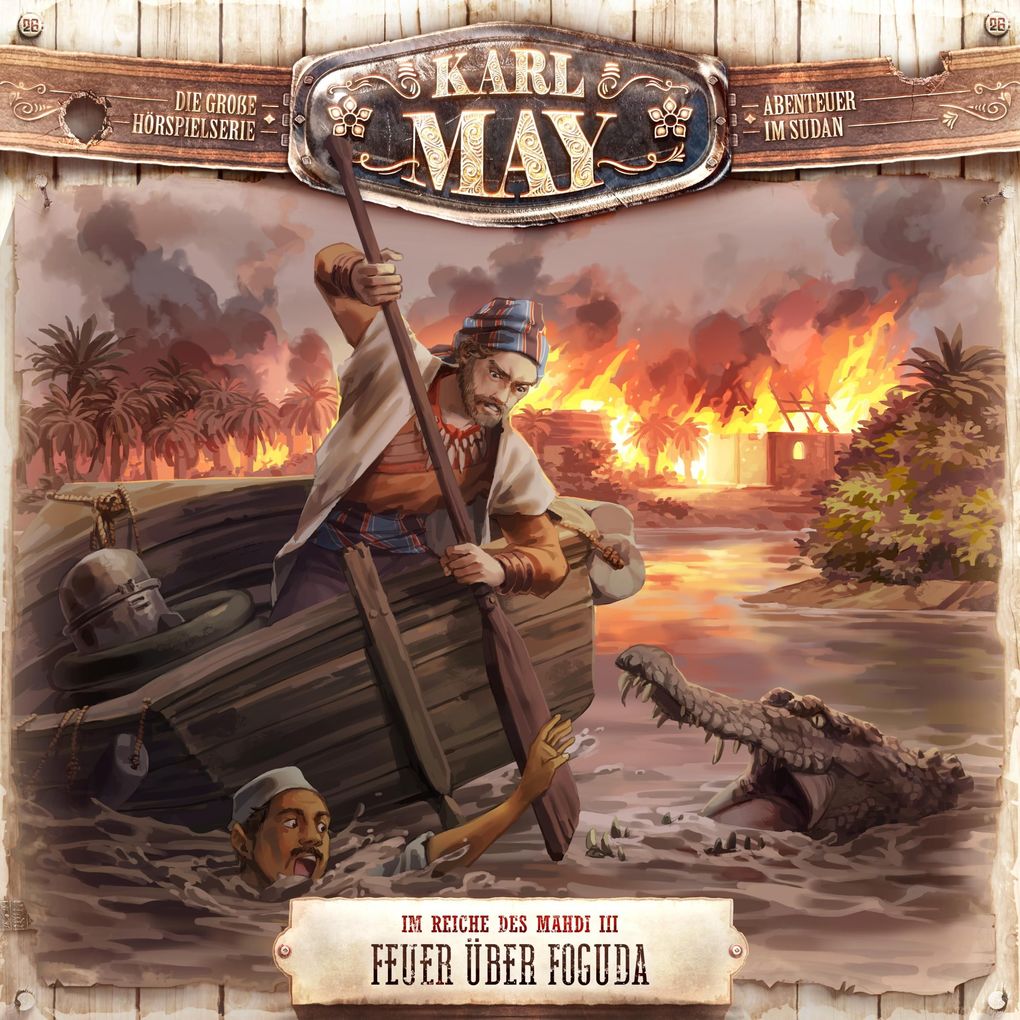 Am Oberen Nil gelingt es Kara Ben Nemsi und seinem Begleiter Ben Nil, Ibn Asls Versteck, die Seribah Aliab, zu finden. Zwar kann der Reis Effendina mit seinen Asakern die Seribah einnehmen, der Anführer der Sklavenjäger ist aber nicht dort. Von dem frustrierten Geschäftsmann Murat Nassyr erfahren Kara Ben Nemsi und der Reis Effendina von Ibn Asls nächstem Ziel: Er will mit seinen Leuten und aufgehetzten Dinka-Kriegern Wagunda überfallen, das größte aller Gohk-Dörfer, um dort Sklaven zu machen. . . und Ibn Asls Schiff "Eidechse" hat bereits einen riesigen Vorsprung. Um den Weg nach Wagunda abzukürzen, geht Kara Ben Nemsi ein lebensgefährliches Wagnis ein. Er durchquert mit Ben Nil, Djangeh, Selim und einem Führer der Bor einen riesigen Sumpf. Als sich die Freunde später trennen, um Verstärkung aus dem Dorf Foguda zu holen, geraten Kara Ben Nemsi, Ben Nil und Selim in einen Hinterhalt der Sklavenjäger. Völlig hilflos muss Kara Ben Nemsi mit ansehen, wie Ibn Asl Tod und Flammen über Foguda bringt. Damit scheint auch das Schicksal der Freunde und von Wagunda besiegelt zu sein . . . - Meist überlegen und sich dessen auch bewusst, strotzt Karl Mays fiktives Abenteuer-Ich in den Reiseerzählungen selbst in den ausweglosesten Situationen vor Ruhe und Zuversicht. So ist es zum Beispiel, als sich Old Shatterhand mit seinen Begleitern Sam Hawkens, Dick Stone und Will Parker im ersten "Winnetou"-Band in der Gewalt der Apachen befindet, und so ist es auch, nachdem Kara Ben Nemsi im dritten "Mahdi"-Band dem brutalen Sklavenjäger Ibn Asl in die Fänge geraten ist. "Ich habe nicht das kleinste Stäubchen meiner Hoffnung verloren", entgegnet er im Gespräch mit dem bedrückten Ben Nil zuversichtlich. Beim Schreiben unserer Karl-May-Hörspielserie war ich von der ersten Folge an bemüht, den Helden etwas nahbarer und auch menschlicher erscheinen zu lassen, und so ist ihm - dank Oliver Felds wunderbarem Schauspiel - die Verzweiflung anzumerken, als er feststellen muss, dass er dem bösartigen und brutalen Ibn Asl vollkommen ausgeliefert ist. - Die Buchfassung von Karl Mays Abenteuer-Trilogie "Im Lande des Mahdi" wurde erstmals 1896 im Rahmen der "Gesammelten Reiseromane" beim Verlag von Friedrich Ernst Fehsenfeld veröffentlicht. Es war dasselbe Jahr, in dem auch der erste Band der "Satan und Ischariot"-Trilogie und der dritte Band der "Old Surehand"-Trilogie als Buch veröffentlicht wurden. Die erste Version von Karl Mays großer Abenteuergeschichte "Der Mahdi" war in Fortsetzungen von 1891 bis 1893 in der Zeitschrift "Deutscher Hausschatz" erschienen. (Eric Zerm, Manuskript-Autor)