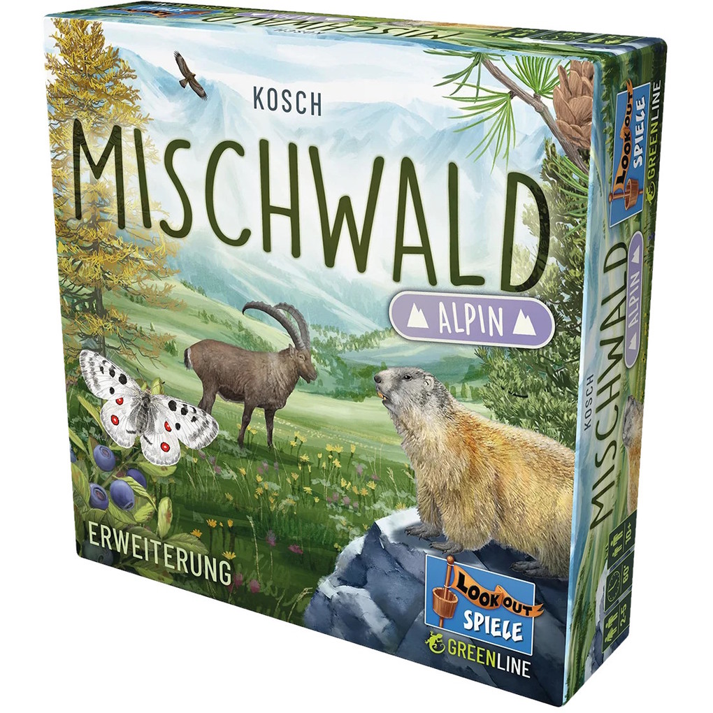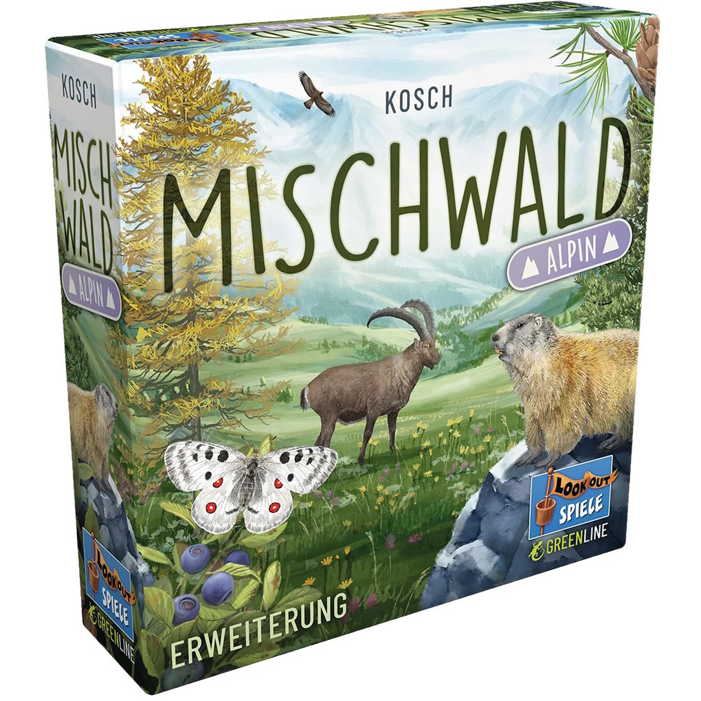Die Erweiterung Mischwald Alpin fügt 36 neue Karten mit alpiner Flora und Fauna hinzu, darunter zwei neue Baumarten. Sie bringt mehr Abwechslung und strategische Tiefe ins Spiel und ist wie das Grundspiel kunststofffrei (Lookout Green Line).