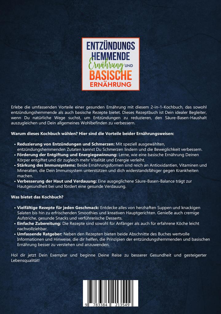 Erlebe die umfassenden Vorteile einer gesunden Ernährung mit diesem 2-in-1-Kochbuch, das sowohl entzündungshemmende als auch basische Rezepte bietet. Dieses Rezeptbuch ist Dein idealer Begleiter, wenn Du natürliche Wege suchst, um Entzündungen zu reduzieren, den Säure-Basen-Haushalt auszugleichen und Dein allgemeines Wohlbefinden zu verbessern. Warum dieses Kochbuch wählen? Hier sind die Vorteile beider Ernährungsweisen:- Reduzierung von Entzündungen und Schmerzen: Mit speziell ausgewählten, entzündungshemmenden Zutaten kannst Du Schmerzen lindern und die Beweglichkeit verbessern. - Förderung der Entgiftung und Energiegewinnung: Lerne, wie eine basische Ernährung Deinen Körper entgiftet und dir zugleich mehr Vitalität und Energie verleiht. - Stärkung des Immunsystems: Beide Ernährungsformen sind reich an Antioxidantien, Vitaminen und Mineralien, die Dein Immunsystem unterstützen und dich widerstandsfähiger gegen Krankheiten machen. - Verbesserung der Haut und Verdauung: Eine ausgeglichene Säure-Basen-Balance trägt zur Hautgesundheit bei und fördert eine gesunde Verdauung. Was bietet das Kochbuch? - Vielfältige Rezepte für jeden Geschmack: Entdecke alles von herzhaften Suppen und knackigen Salaten bis hin zu erfrischenden Smoothies und kreativen Hauptgerichten. Genieße auch cremige Aufstriche, gesunde Snacks und verführerische Desserts. - Einfache Zubereitung: Die Rezepte sind sowohl für Anfänger als auch für erfahrene Köche leicht nachvollziehbar. - Umfassende Ratgeber: Neben den Rezepten bieten beide Abschnitte des Buches wertvolle Informationen und Hinweise, die dir helfen, die Prinzipien der entzündungshemmenden und basischen Ernährung besser zu verstehen und anzuwenden. Hol dir jetzt Dein Exemplar und beginne Deine Reise zu besserer Gesundheit und gesteigerter Lebensqualität!