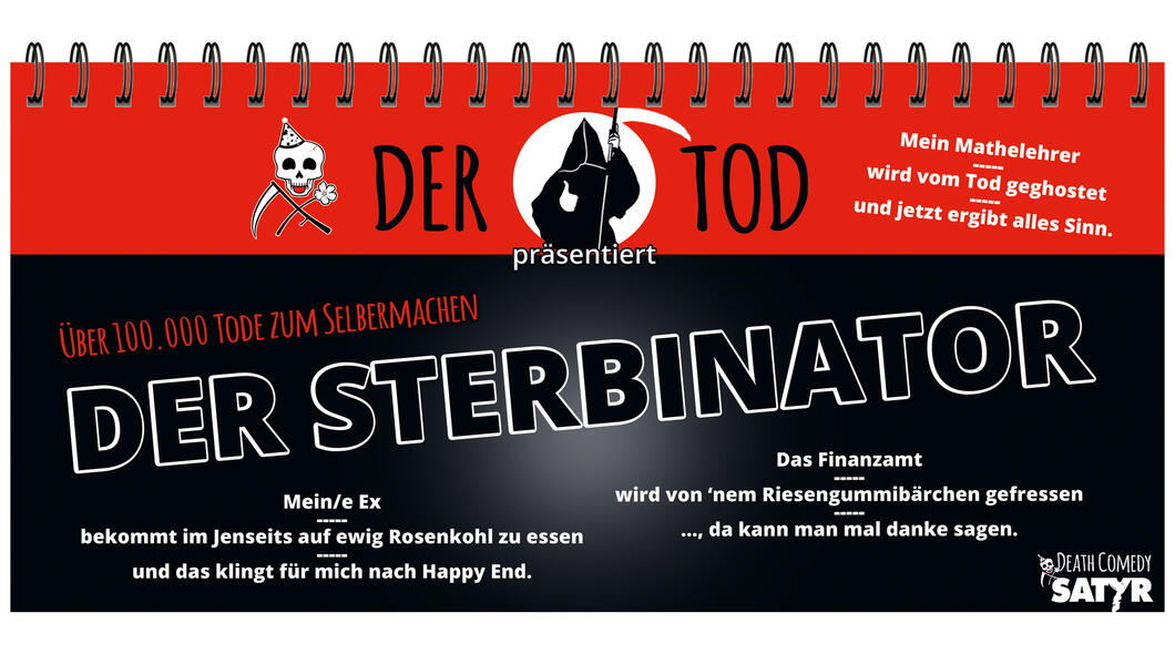 Seit dreizehn Jahren ist DER TOD von den deutschsprachigen Comedybühnen nicht mehr wegzudenken. Mit dem STERBINATOR erscheint nun sein schon viertes Werk bei Satyr: Mit schwarzem Humor und kreativem Geschick bietet dieser Aufsteller für alle wahren Bösewichte des Lebens die jeweils beste Die-it-yourself-Lösung. Endlich kann man sich ganz ohne schlechtes Gewissen an all denen rächen, die einem in letzter Zeit tierisch auf den Grabstein gingen. Mit dem STERBINATOR bekommt jeder sein Fett weg: »Der Dieb, der mein Fahrrad geklaut hat«, »Das Finanzamt« oder »Die Mücke im Schlafzimmer«. Der Erfinder der Death Comedy hat über 100. 000 Kombinationsmöglichkeiten geschaffen, über die man schmunzeln, diskutieren und schadenfroh glücklich sein kann.