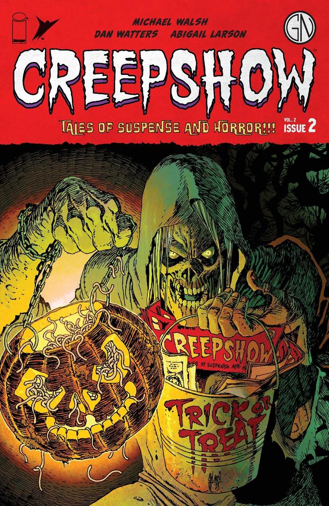 CREEPSHOW is back with two more terrifying tales! First, MICHAEL WALSH (THE SILVER COIN) broadcasts a chilling yarn about a down-on-his-luck dad and his son's obsession with TV in "The Man With No Eyes"! Then, DAN WATTERS (HOMESICK PILOTS, Arkham City) and Hugo Award-winning illustrator ABIGAIL LARSON (Sandman Universe: The Dreaming) will render you speechless with the story of a young woman burdened and the price she'll pay for silence in "Stop Haunting Me"!
