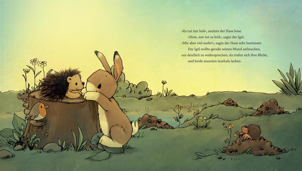 In der Geschichte geht es um die beiden allerbesten Freunde, den kleinen Hasen und den Igel. Die beiden spielen zusammen und im Laufe des Nachmittags buddelt der Hase eine Wurzel aus, die er ganz toll findet. Doch dann geraten die beiden Freunde in einen heftigen Streit um die Wurzel. Jeder möchte sie alleine für sich haben und die beiden werden sich nicht einig, wem die Wurzel nun gehört. Der Streit wird hitziger und die Gefühle kochen richtig hoch. Die beiden versöhnen sich auch am Abend nicht und schlafen ganz schlecht. Sie sehen beide ein, dass ihre Freundschaft viel wichtiger ist als alles andere und dass sie einander vermissen, beide traurig sind und sich eigentlich einfach nur wünschen, wieder gemeinsam spielen und Abenteuer erleben zu können. So entschuldigen sie sich beide am nächsten Morgen beieinander und genießen ihre Freundschaft, auf die sie zukünftig besser aufpassen und achtsamer und wertschätzender damit umgehen wollen.