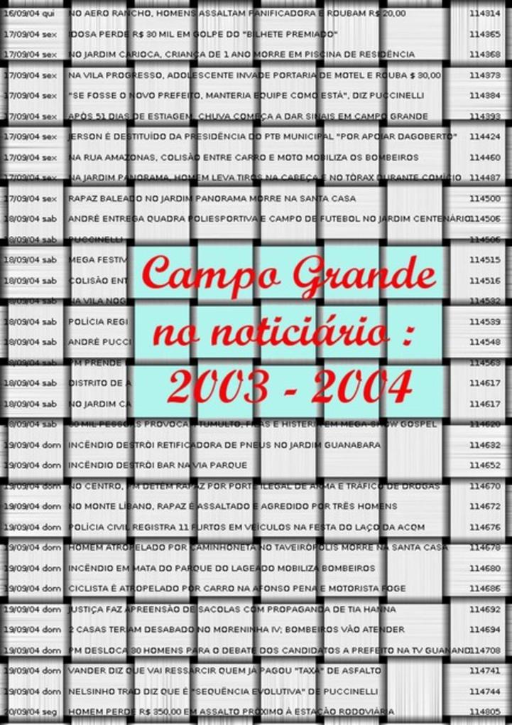Obra historiográfica. Foram compiladas todas as notícias, relativas ao município de Campo Grande - MS, publicadas nos anos de 2003 e 2004 pelo saite MidiamaxNews. Dessas notícias, foi efetuada a seleção das mais significativas (excluídas aquelas repetitivas ou de mero merchandising), e anotadas as respectivas manchetes. Grande parte dessas manchetes foi editada para incorporar mais elementos informativos.