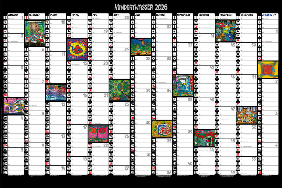 Der Hundertwasser Jahresplaner Art 2026, ist einer der attraktivsten Wandplaner. Durch die 13 integrierten Bilder von Hundertwasser, die hochwertig reproduziert und mit Metallfolien veredelt sind, hebt sich dieser Jahresplaner in Sachen Ästhetik und Qualität deutlich von üblichen Wandplanern ab. Durch das große Format von 68 x 102 cm bietet er ausreichend Platz für tägliche Notizen.