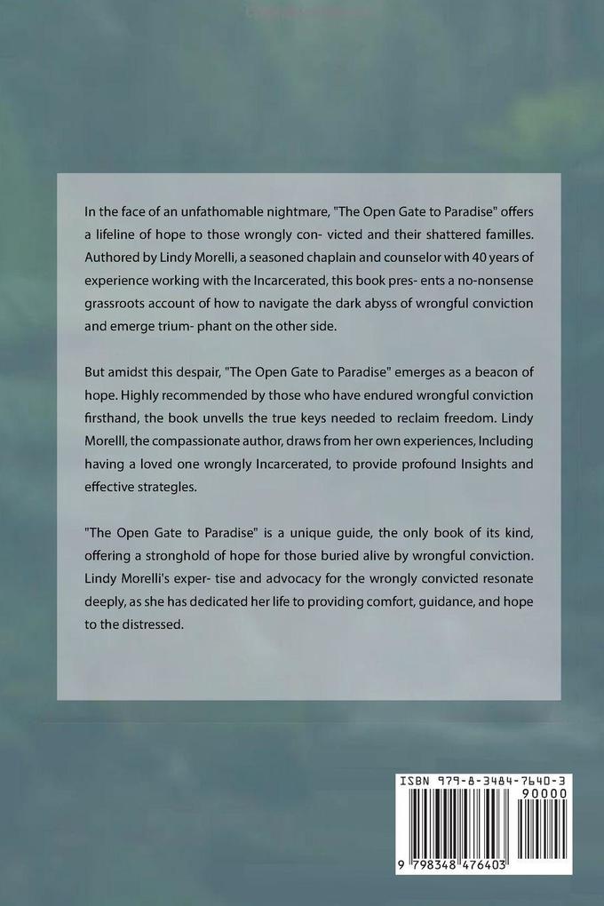 The Open Gate to Paradise is a powerful guide recommended by those who have experienced it firsthand-the wrongly convicted and their families. A no-nonsense, grassroots account, this book provides real keys to freedom when you're "buried alive." It offers practical steps to help you navigate the storm of wrongful conviction and turn tragedy into triumph.